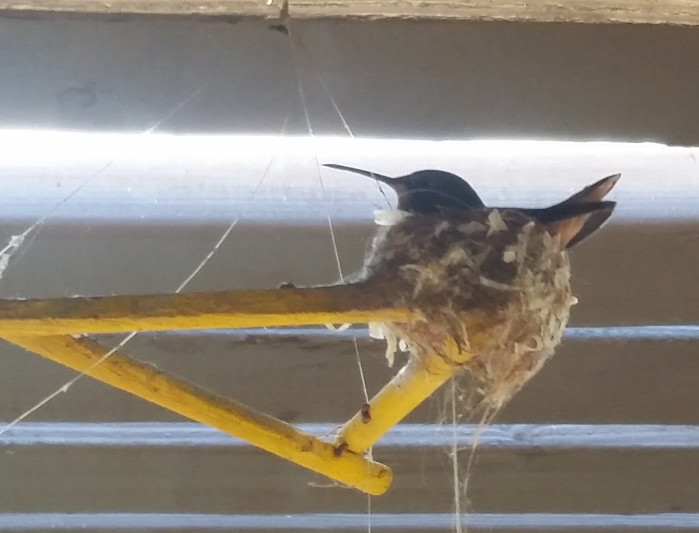 I later learned that hummingbirds build their nests even before they mate. The female prepares ahead of time for the big event…sort of like the famous quote in Field of Dreams: “Build it and they will come.” Little did I know, our mobile hanging under the eaves of our backyard patio roof was a preferred spot for a nest, being safe from predators, near a source of food (our feeders and other garden flowers) and in the shade. I also learned that mamas love to build with spider webs, (of which we had an ample supply), as they are sticky and hold all the loose fluff, plant fibers and sticks in place. In other words, a nest is the perfect union of spider and bird. Weird but true.