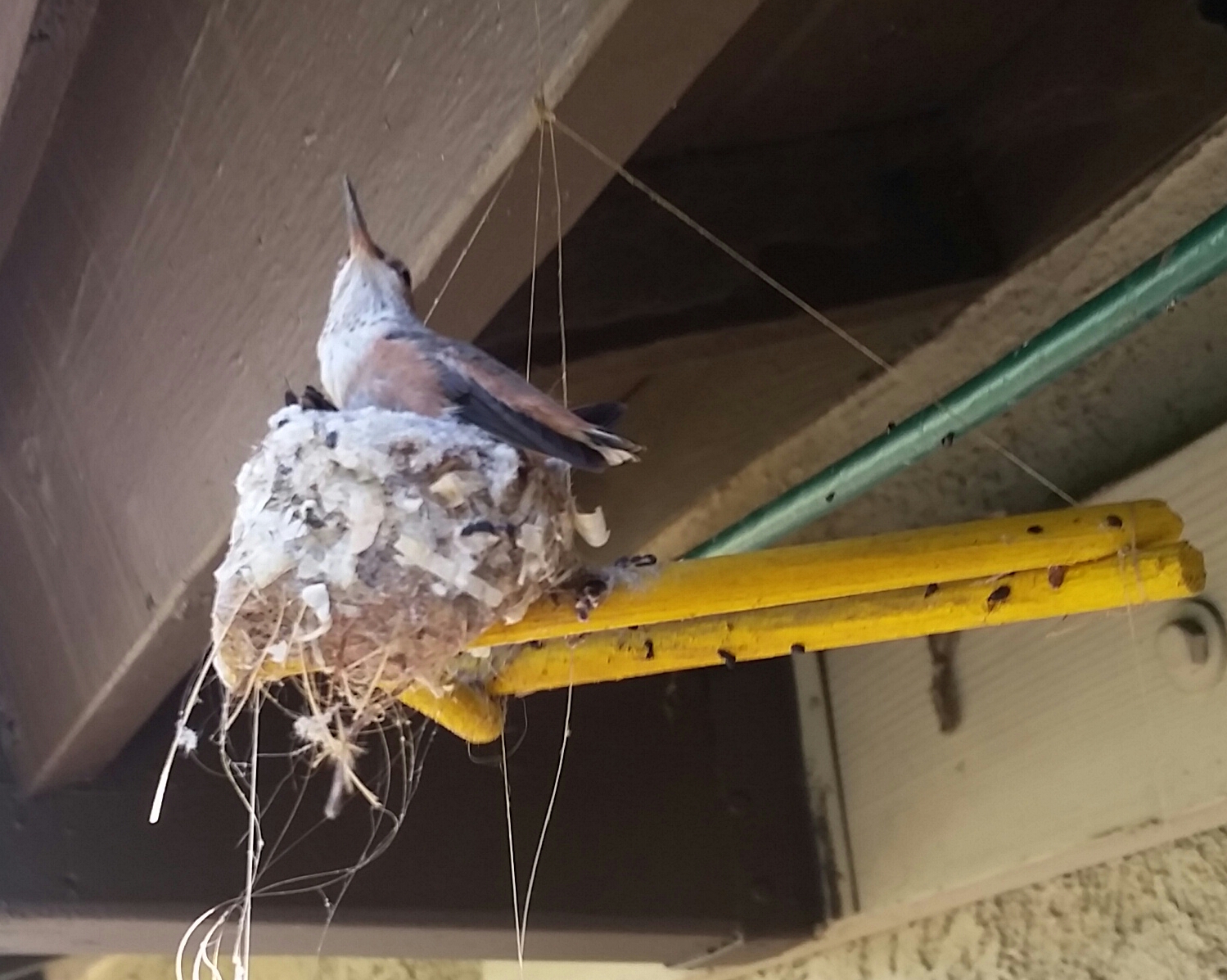 I toyed with removing the fish mobile with the nest on it, but I didn’t have the heart. Several months passed when suddenly we noticed a new mama bird bringing her own fluff, webs and bits of pieces of things to add to the existing nest. We were going to be hummingbird parents once again! Oh, nooooo!
