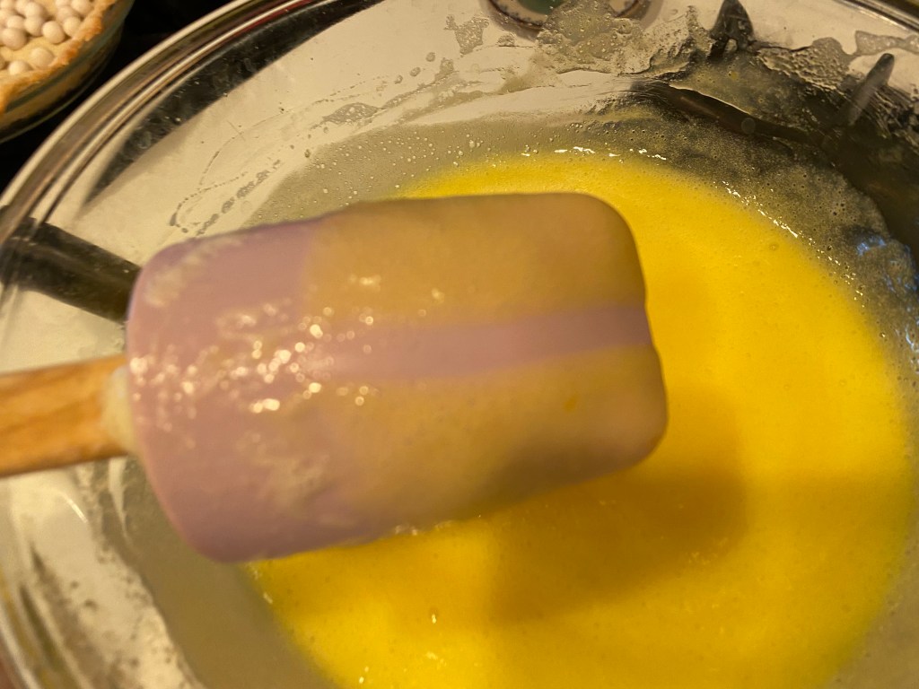 (Please note: you do not need any fancy gadgets or Williams-Sonoma pots or pans to make this pie. I use a small hand-held electric beater that is probably 35 years old and only has medium and high settings working. I also use a glass bowl and put it on top of a pot of boiling water to make the custard.)