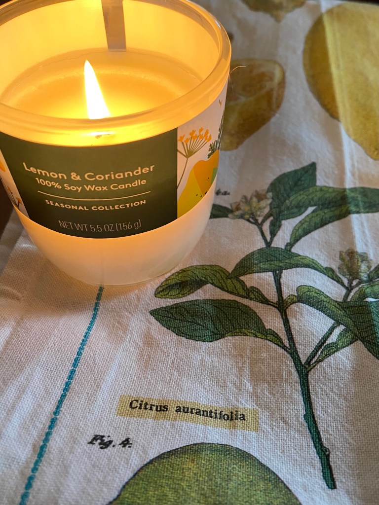 Kitchen favorites: Lemon candle with citrus theme dish towel.